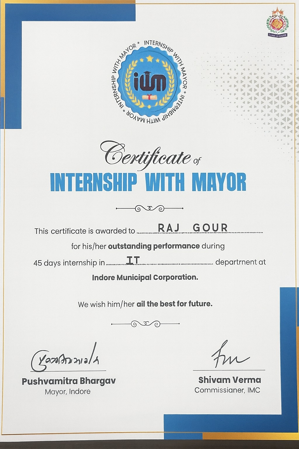 Successfully completed a 2-month Internship at IMC under Internship with Mayor (IWM) Program, Indore. Worked on responsive UI components and contributed to improving user experience on internal web modules.